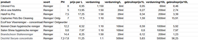 Verbruikskosten schoonmaakproducten per L en 10L verdunning